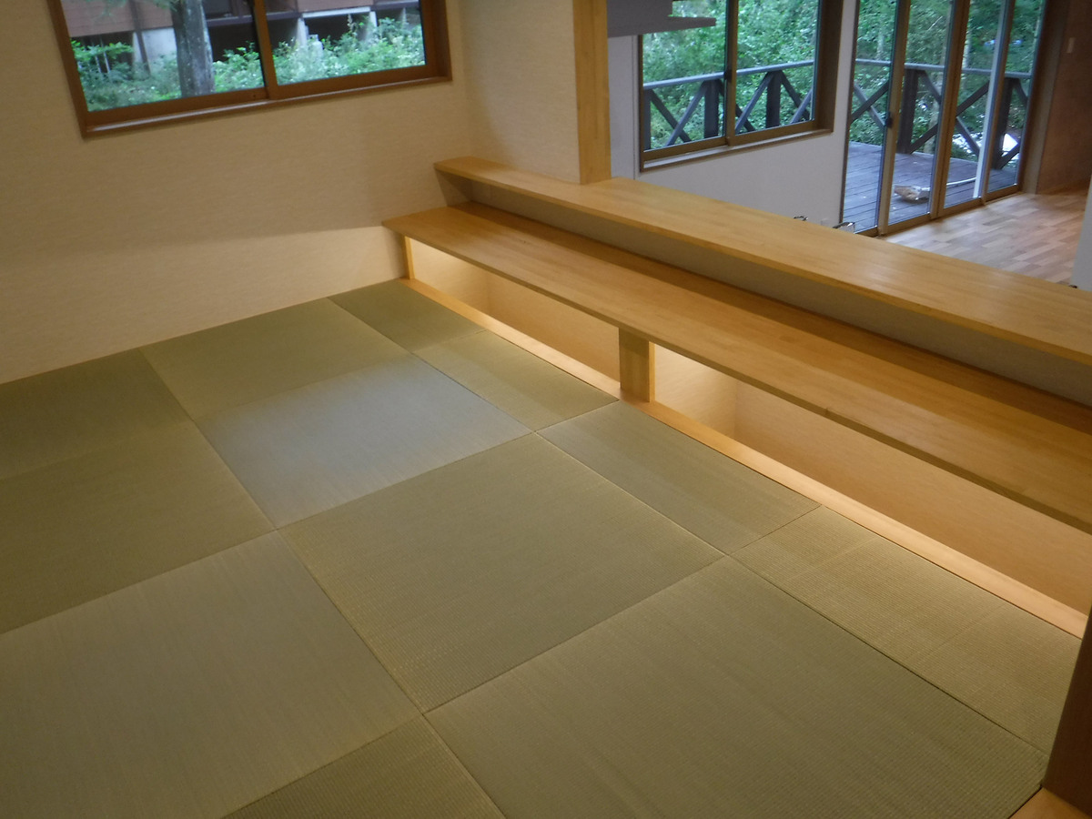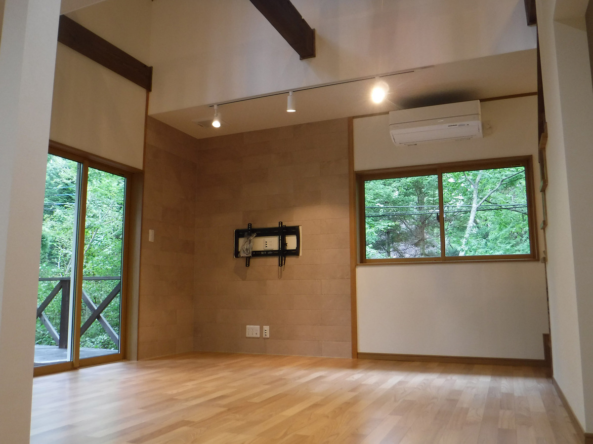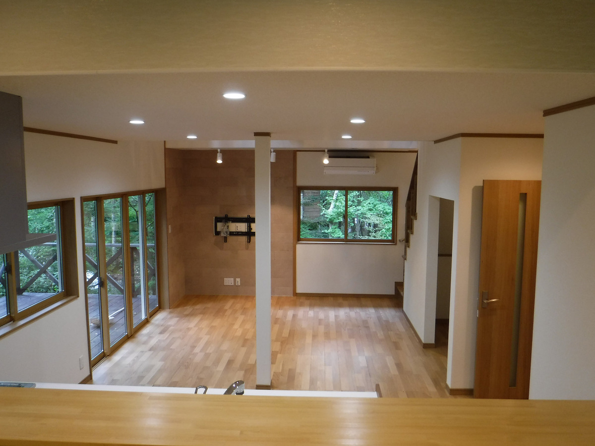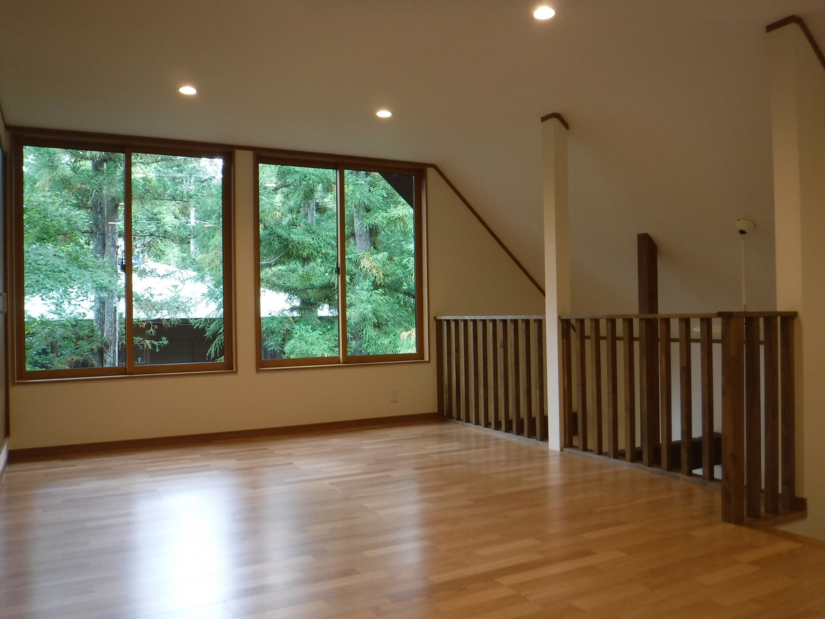 築40年のフルリノベーション物件です。通常のリノベーション工事とは違い、快適に長く過ごせるように、築40年を考慮した構造体の補強を行いました。間取りについても、従来の間取りではなかった吹き抜けを付け解放感を演出しました。1階部分の段差を活用したキッチンですが、段差上の和室にはお料理を楽しんだり、作業できるカウンターを設置致しました。リビング壁面一部には、エコカラットを施工し重厚感を演出致しました。また、御施主様のこだわりのライティングですが、実はBluetooth機能がついており、遠隔操作で調光・調色の調整が可能となっております。御施主様のこだわりが随所にある山荘となりました。